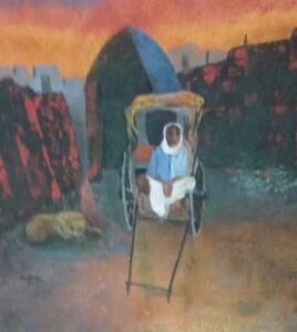 Her faith in phenomenal nature as the ultimate source of forms and configuration, duly reflects in the creation by selection of the recollected memories of the observed contents as configuration of colour-masses with shapes defined by contour lines on dimensional pictorial surface divided into flat colour areas. These shapes and spaces being the residues of images of the phenomenal terrains, sky, land, roads, plants etc become expressive. The various contour lines with which she encloses the shapely colour masses endow the shapes with a strange kind of organic rhythm thereby rendering expressionism to the work. In a way her works are at a junction between representationalism, formalism and expressionism. She has adopted suggestive colours and common symbols upheld by plastic rhythm and inventive shapes. The insistent flowing vegetative rhythms of semi-abstract and abstract combinations find a significant place in her creations which are both eloquent and lucid as well as thematically relevant.